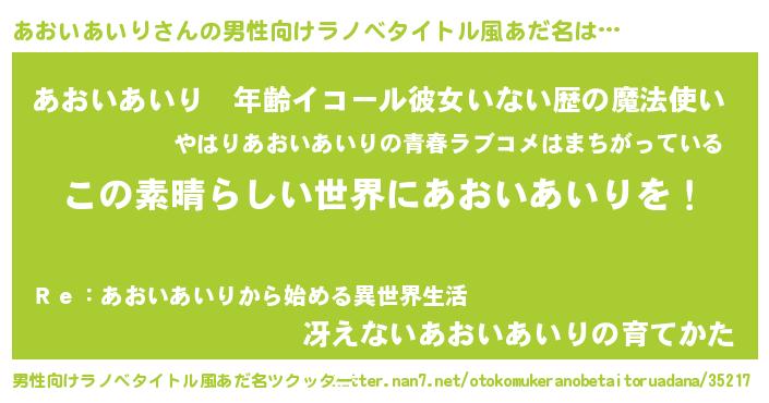 | 女子向けラノベタイトル風あだ名 | 『乙女ゲームの破滅フラグしかない悪役あおいあいりに転生してしまった…』 |