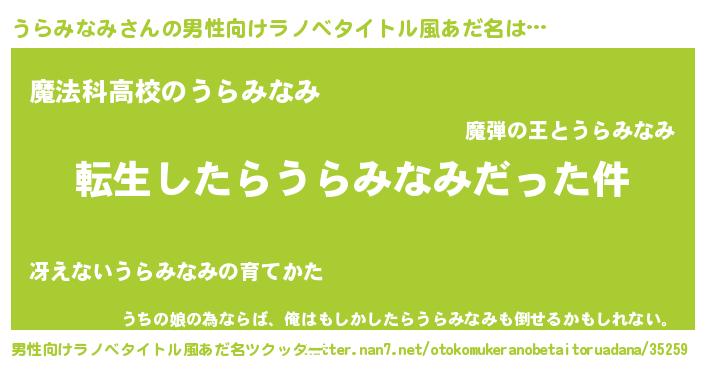 | 女子向けラノベタイトル風あだ名 | 『うらみなみの玉の輿計画!』 |