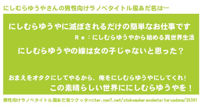 | 女子向けラノベタイトル風あだ名 | 『にしむらゆうやの卵を拾いまして』 |