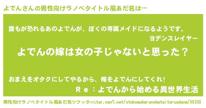 | 女子向けラノベタイトル風あだ名 | 『よでんの卵を拾いまして』『闇のよでん』 |