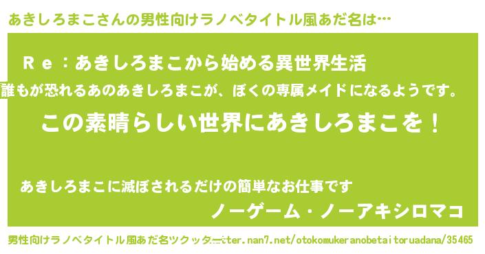 | 胡散臭い通販商品みたいなあだ名 | 『あなたにだけ特別に提供する100年もののヴィンテージワイン…その名も「あきしろまこ」』 |