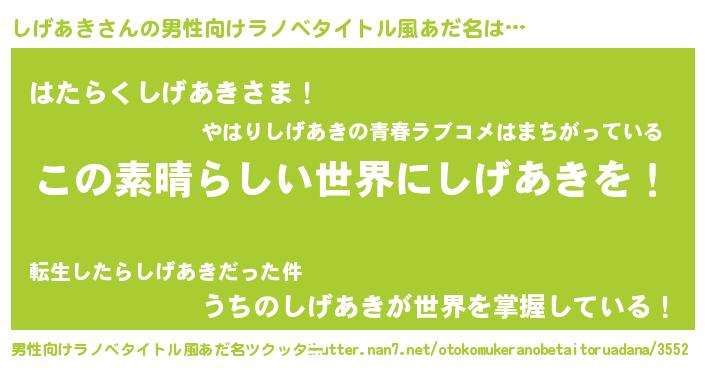 | 女子向けラノベタイトル風あだ名 | 『悪役しげあきに転生したようですが、知った事ではありません』 |