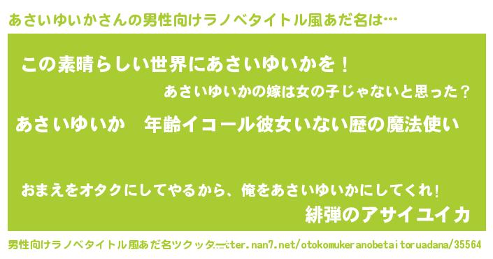 | 胡散臭い通販商品みたいなあだ名 | 『あなたにだけ特別に提供する100年もののヴィンテージワイン…その名も「あさいゆいか」』 |