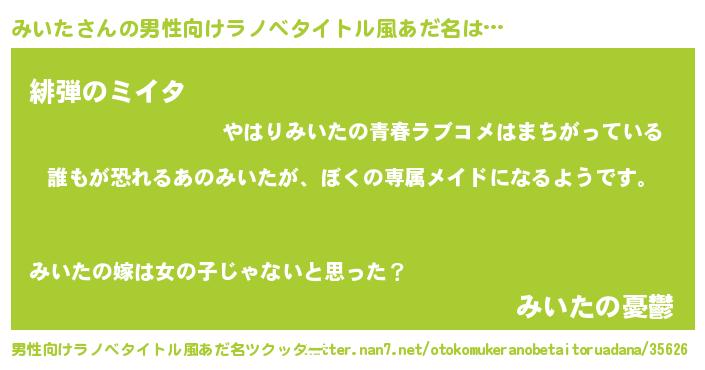 | 女子向けラノベタイトル風あだ名 | 『みいたの契約王妃』『みいた様がみてる』 |