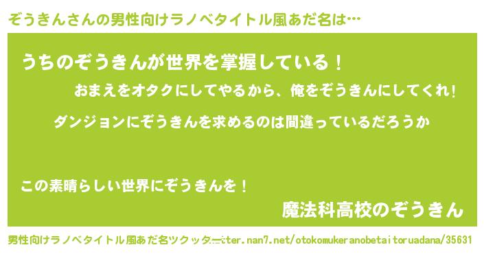 | 女子向けラノベタイトル風あだ名 | 『ぞうきんの卵を拾いまして』 |