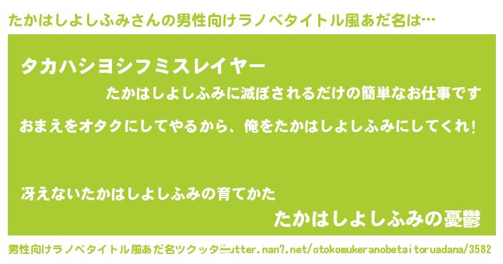 | 女子向けラノベタイトル風あだ名 | 『たかはしよしふみ夫妻のなれそめ』 |