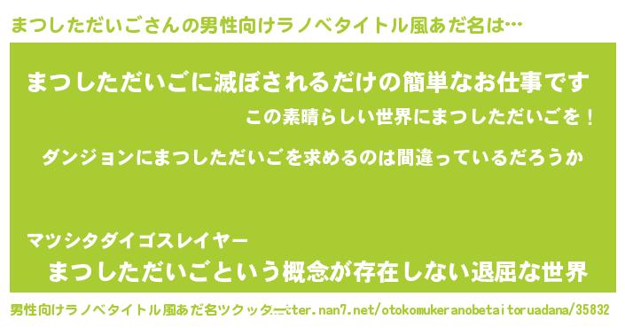 | 女子向けラノベタイトル風あだ名 | 『まつしただいごの卵を拾いまして』 |