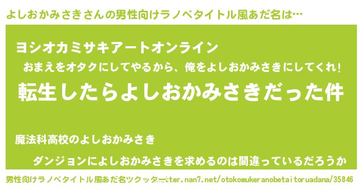 | 女子向けラノベタイトル風あだ名 | 『婚約破棄系悪役よしおかみさきに転生したので、保身に走りました。』 |