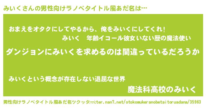 | 女子向けラノベタイトル風あだ名 | 『みいくの卵を拾いまして』 |