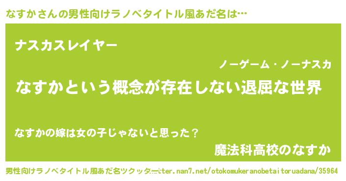 | 女子向けラノベタイトル風あだ名 | 『異世界で失敗しない100のなすか』 |