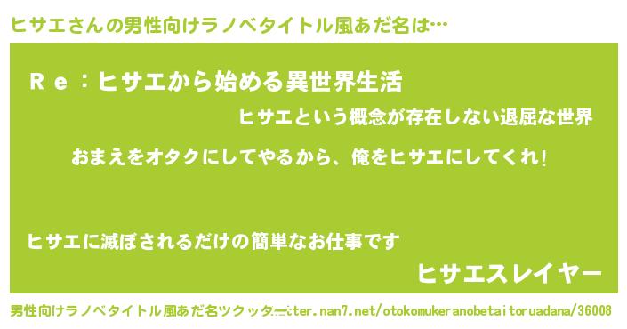 | ヒーロー風カッコイイあだ名 | 『正義の使者ヒサエ』『ネオヒサエ』 |