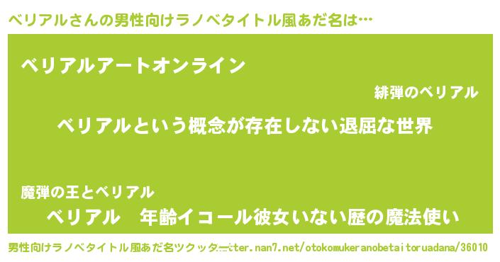 | 女子向けラノベタイトル風あだ名 | 『異世界で失敗しない100のベリアル』 |