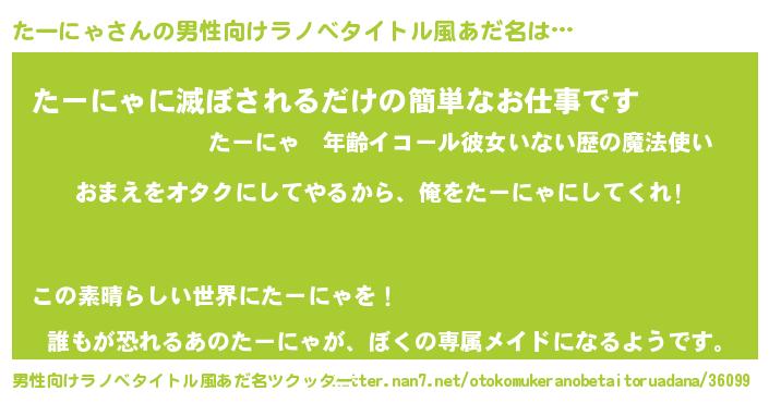 | 胡散臭い通販商品みたいなあだ名 | 『100人中100人が認めたマグネット磁石…その名も「たーにゃ」』 |