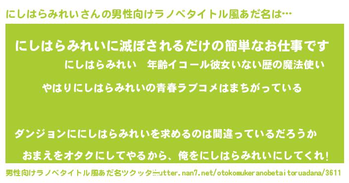 | 胡散臭い通販商品みたいなあだ名 | 『幸せが訪れる高級そうな壺…その名も「にしはらみれい」』 |
