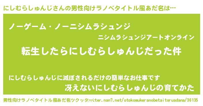 | 女子向けラノベタイトル風あだ名 | 『にしむらしゅんじの玉の輿計画!』 |