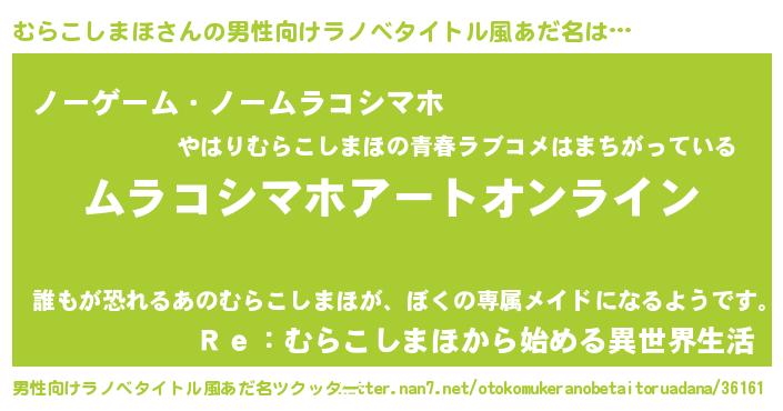 | 女子向けラノベタイトル風あだ名 | 『誰かこのむらこしまほを説明してください! ~契約から始まるウェディング~』 |