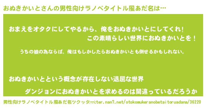 | 女子向けラノベタイトル風あだ名 | 『おぬきかいとの婚約者』 |