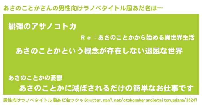 | 女子向けラノベタイトル風あだ名 | 『異世界で失敗しない100のあさのことか』 |