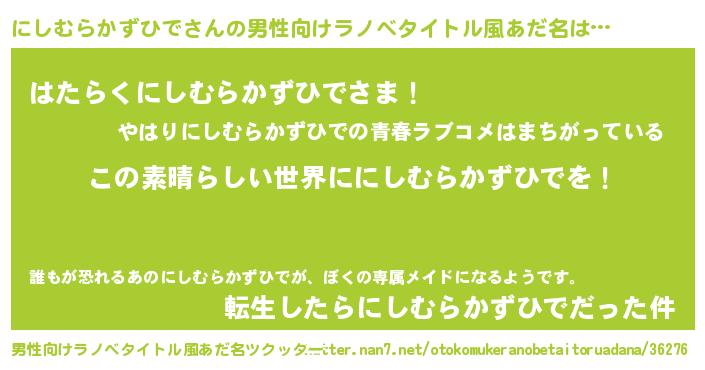 | 女子向けラノベタイトル風あだ名 | 『乙女ゲームの破滅フラグしかない悪役にしむらかずひでに転生してしまった…』 |
