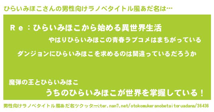 | 女子向けラノベタイトル風あだ名 | 『ひらいみほこの卵を拾いまして』 |