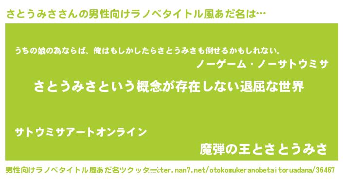 | 胡散臭い通販商品みたいなあだ名 | 『絶対に幸福をもたらす健康食品…その名も「さとうみさ」』 |