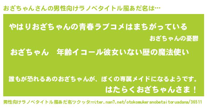 | 女子向けラノベタイトル風あだ名 | 『おざちゃんの玉の輿計画!』 |