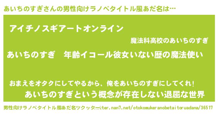 | 女子向けラノベタイトル風あだ名 | 『あいちのすぎの玉の輿計画!』 |
