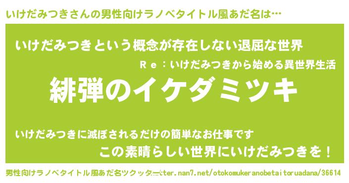 | 胡散臭い通販商品みたいなあだ名 | 『絶対に幸福をもたらす水素水…その名も「いけだみつき」』 |