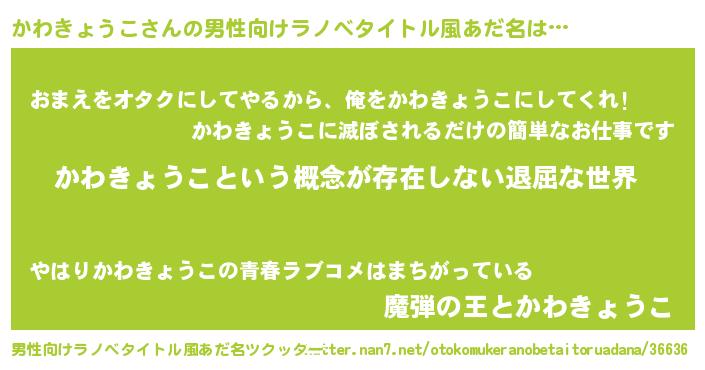 | 女子向けラノベタイトル風あだ名 | 『異世界で失敗しない100のかわきょうこ』 |