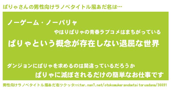| 胡散臭い通販商品みたいなあだ名 | 『絶対に幸福をもたらす招き猫…その名も「ぱりゃ」』 |