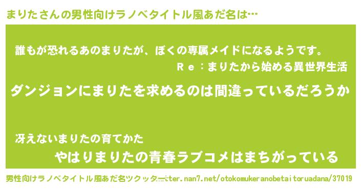 | 女子向けラノベタイトル風あだ名 | 『まりたの卵を拾いまして』『闇のまりた』 |