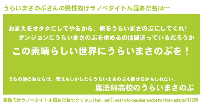 女子向けラノベタイトル風あだ名 | 『悪役うらいまさのぶに転生したようですが、知った事ではありません』 |