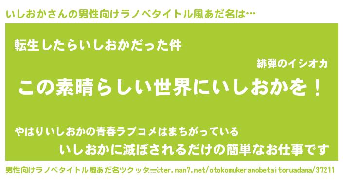 | 女子向けラノベタイトル風あだ名 | 『乙女ゲームの破滅フラグしかない悪役いしおかに転生してしまった…』 |