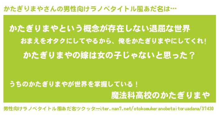 | 女子向けラノベタイトル風あだ名 | 『かたぎりまやの卵を拾いまして』 |