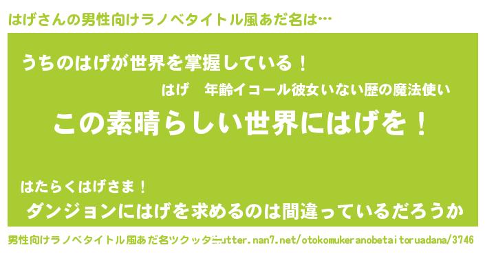 | 女子向けラノベタイトル風あだ名 | 『悪役はげに転生したようですが、知った事ではありません』 |