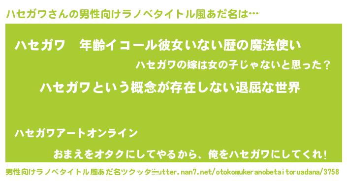 | 女子向けラノベタイトル風あだ名 | 『異世界で失敗しない100のハセガワ』 |