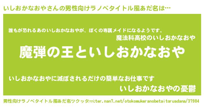 | 女子向けラノベタイトル風あだ名 | 『いしおかなおやが死なない童話 林檎のいしおかなおやの診療簿』 |