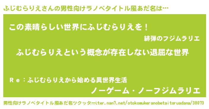 | 女子向けラノベタイトル風あだ名 | 『異世界で失敗しない100のふじむらりえ』 |