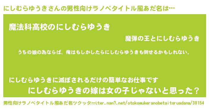 | 女子向けラノベタイトル風あだ名 | 『にしむらゆうき伯爵の花嫁』 |