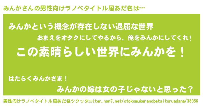 | 胡散臭い通販商品みたいなあだ名 | 『あなたにだけ特別に提供する限定10本のレアな日本酒…その名も「みんか」』 |