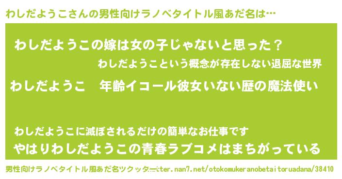 | 女子向けラノベタイトル風あだ名 | 『わしだようこの玉の輿計画!』 |