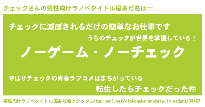| 女子向けラノベタイトル風あだ名 | 『死神チェックの再婚』 |