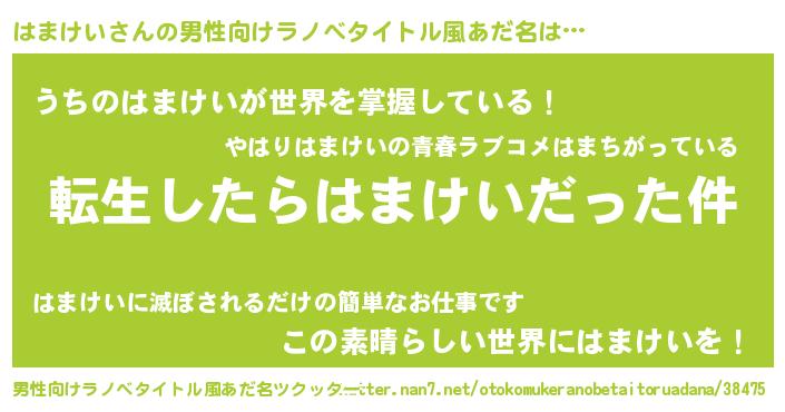 | 女子向けラノベタイトル風あだ名 | 『はまけいの玉の輿計画!』 |