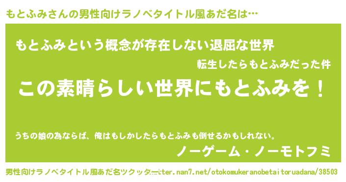 | 女子向けラノベタイトル風あだ名 | 『悪役もとふみに転生したようですが、知った事ではありません』 |
