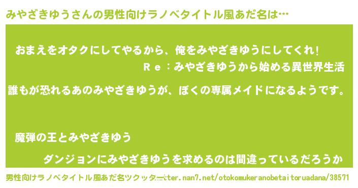 | 女子向けラノベタイトル風あだ名 | 『みやざきゆうの契約王妃』 |