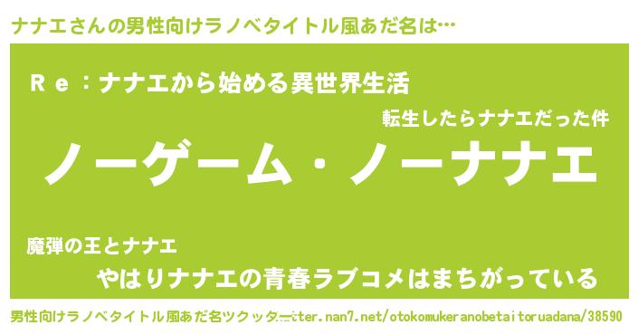 | 女子向けラノベタイトル風あだ名 | 『死神ナナエの再婚』 |
