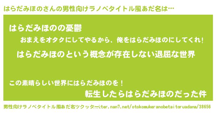 | 女子向けラノベタイトル風あだ名 | 『異世界で失敗しない100のはらだみほの』 |