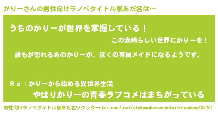 | 胡散臭い通販商品みたいなあだ名 | 『来世でも幸せになれる水素水…その名も「かりー」』 |