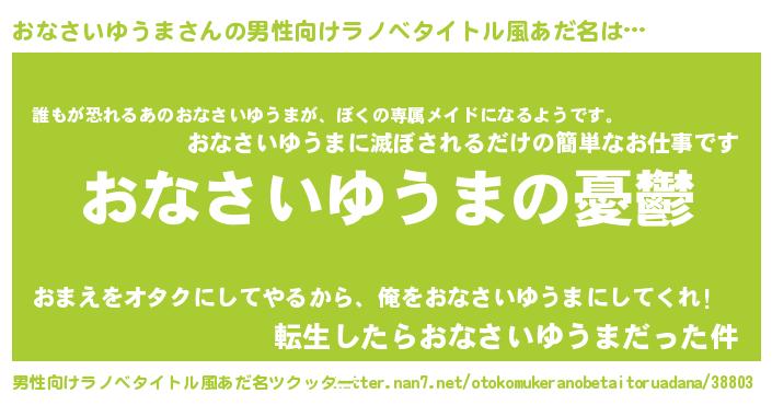 | 女子向けラノベタイトル風あだ名 | 『(仮)おなさいゆうまのやんごとなき事情』 |