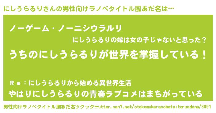 | 女子向けラノベタイトル風あだ名 | 『男装にしうらるりの憂鬱な任務』 |